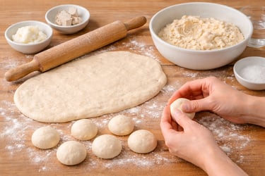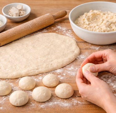 Roll out the dough to 5–6 mm thickness and cut discs about 7–8 cm wide.